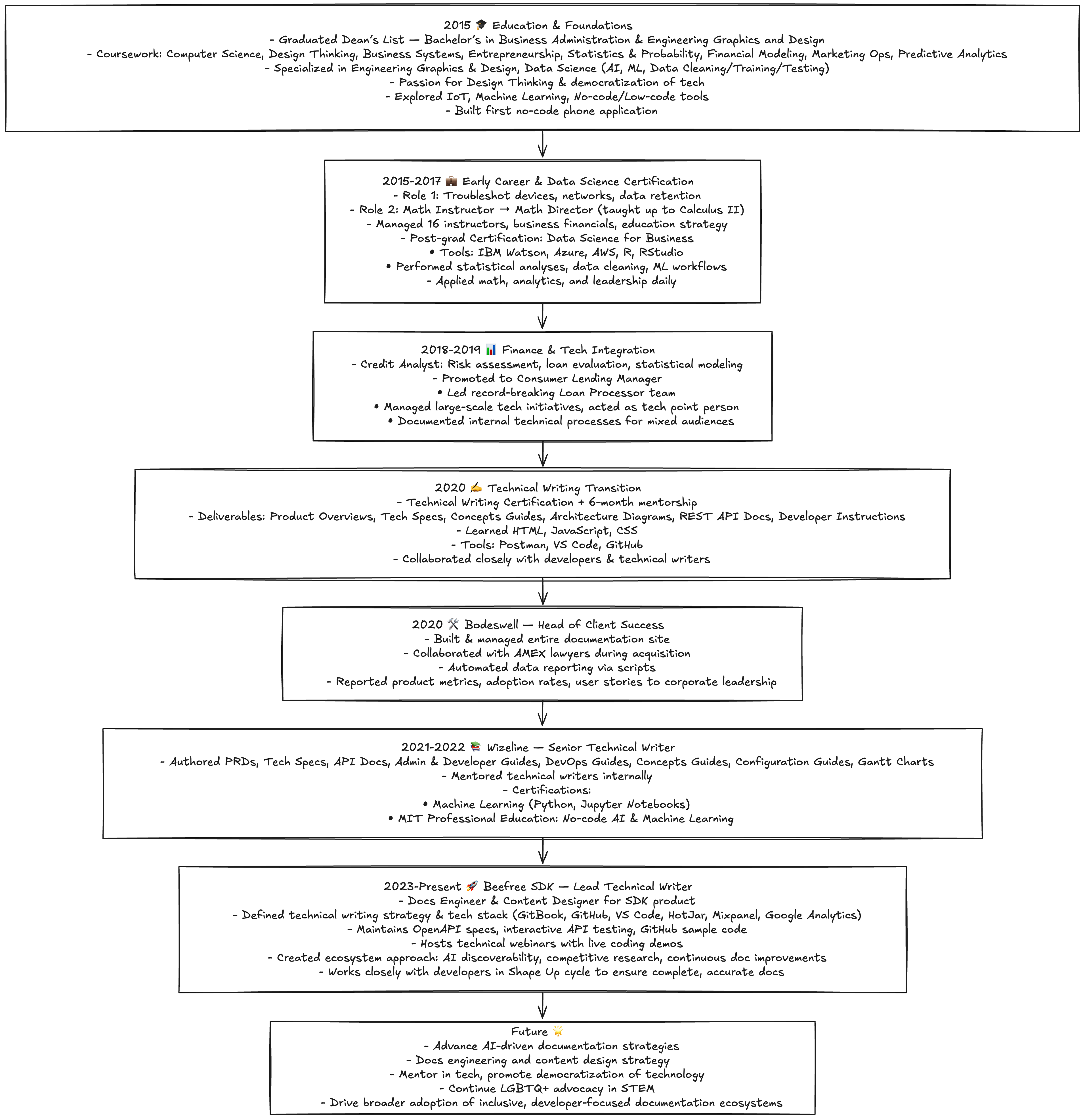 Before becoming a Lead Technical Writer, I built my career through a mix of technical, analytical, and leadership roles—managing teams, teaching advanced mathematics, running a business unit, leading credit risk analysis, and spearheading technology adoption initiatives. Along the way, I became skilled in tools like GitBook, GitHub, VS Code, Postman, HotJar, Mixpanel, Google Analytics, IBM Watson, Microsoft Azure, AWS, and RStudio, as well as programming in HTML, JavaScript, CSS, and working with OpenAPI specifications.